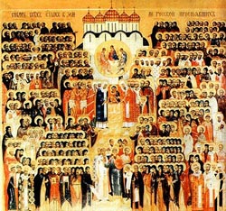 En d’ autres termes, et pour employer notre terminologie actuelle, St. Jean Chrysostome soutient non seulement un œcuménisme dans l’espace (géographique), mais aussi un œcuménisme dans le temps, c.àd.. notre unité et notre κοινωνία avec toutes les époques de l’Eglise, avec les fidèles de tous les siècles, avec tous les Saints ayant vécu jadis sur terre et vivant maintenant dans les cieux. Car ils sont tous avec nous les membres vivants du corps du Christ, or ce corps est toujours Un (ἕν τό σῶμα τῶν πιστῶν … καί τό σῶμα τοῦτο οὐ χρόνος διέστησεν, οὐ τόπος …, PG 56, 277. Cf. Homélie 10, 1 sur Eph., PG 62, 75). Ici donc il fa l lait parler de communio sanctorum au ciel. Mais, nous n’avons pas de temps maintenant. Cette unité catholique et cette κοινωνία catholique, à la fois eucharistique et ecclésiologique, sur la terre et au ciel, St. Jean Chrysostome, suivant en cela l’Apôtre Paul (1 Cor. 1, 9), les désigne d’un seul et même terme: la communion du Monogène κοινωνία τοῦ Μονογενοῦς (Homélie sur les Psaumes 8,7, PG 55,117).