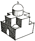 Cross-In SquareOf the large number of Byzantine church plans incorporating domes, we shall consider the one that became most widespread. This is the “cross-in-square” plan, adopted in Constantinople in the later ninth century, after the Iconoclastic Controversy had ended (about which more will be said). In the simplest terms, this kind of church is cubical on the first level and cruciform on the second, with a dome resting on a cylinder at the intersection of the arms of the cross, and smaller domes or vaults over the four corners of the cube, between the arms of the cross. Schematically it looks like this: