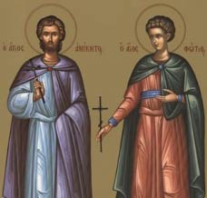 Οι μάρτυρες κατάγονταν και οι δύο από τη Νικομήδεια. Όταν ο αυτοκράτορας Διοκλητιανός θέλησε να κηρύξει διωγμό κατά των χριστιανών, μίλησε ενώπιον της Συγκλήτου με υβριστικούς λόγους εναντίον τους. Ο Ανίκητος που ήταν παρών, όταν άκουσε τον λόγο του Διοκλητιανού ομολόγησε με παρρησία ότι είναι Χριστιανός: Ο Διοκλητιανός διέταξε και τον έριξαν στα λιοντάρια, που όμως δεν του επιτέθηκαν. Εκείνη τη στιγμή έγινε μεγάλος σεισμός και συνετρίβησαν πολλά ειδωλολατρικά αγάλματα. Οι βασανιστές του δεν πτοήθηκαν και τον έβαλαν σε τροχό με αναμμένη φωτιά από κάτω, αλλά ο τροχός σταμάτησε και η φωτιά έσβησε. Τότε έτρεξε και τον ασπάστηκε ο ανεψιός του Φώτιος. Μόλις είδαν αυτό οι ειδωλολάτρες, έδεσαν και τους δύο μέσα στο λεγόμενο λουτρό του Αντωνίου. Και αφού υπερθέρμαναν το νερό, παρέδωσαν και οι δύο ένδοξα το πνεύμα τους.