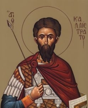 Μαρτύρησε στη Ρώμη επί Διοκλητιανού (284-304). Είχε μεγαλώσει με χριστιανική ανατροφή, και όταν κατετάγη στο Ρωμαϊκό στρατό, δεν εγκατέλειψε τις ευσεβείς συνήθειές του. Μια από αυτές ήταν η βραδυνή προσευχή. Κάποιοι ειδωλολάτρες στρατιώτες κατήγγειλαν το γεγονός στον ειδωλολάτρη στρατηγό Περσεντίνο. Εκείνος, αφού διέταξε πρώτα τον βασανισμό του, ακολούθως διέταξε να τον τοποθετήσουν μέσα σε ένα δεμένο σάκκο και να τον ρίξουν στη θάλασσα. Με θαυματουργό τρόπο ο σάκκος σχίστηκε και δύο δελφίνια έσωσαν τον Καλλίστρατο. Σαράντα εννέα στρατιώτες που είδαν το θαύμα πίστεψαν στον Χριστό. Ο Περσεντίνος τότε εξοργισθείς διέταξε τον αποκεφαλισμό όλων.