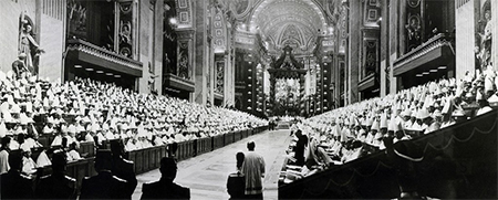La nécessité de convoquer un concile œcuméniquepour lÉglise catholique romaine avait déjà été relevée dans la Bulle Aeterni Patris1 (1868) du pape Pie IX, ce qui fut en partie réalisé par lœuvre du Premier Concile du Vatican (1869-1870). Cependant, lunification du Royaume dItalie (1866-1871) en interrompit2 les travauxpeu après lapprobation de la première Constitution dogmatique de lÉglise du Christ3, puis les deux Guerres mondiales (1914-1918 et 1939-1945) limitèrent dans une grande mesure toute forme dexpression de lopinion ecclésiastique. Il est donc compréhensible que, de la fin du XIXe siècle à celle de la Seconde Guerre mondiale, lÉglise catholique était dans limpossibilité dorganiser la continuation des travaux du concile du Vatican interrompu. Dans ce sens, Vatican II (1962-1965) pourrait être qualifié de suite du premier concile, dont lœuvre était restée inachevée en raison des conflits militaires des États occidentaux et de bien dautres péripéties4 de lÉglise catholique, puisque subsistait le besoin dune réponse conciliaire aux questions qui préoccupaient le monde moderne et qui entraient en conflit direct avec la théologie occidentale conservatrice.