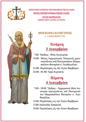 Ο βίος και το μαρτύριο της Αγίας Μεγαλομάρτυρος Βαρβάρας όπως τον συνέγραψε ο Πανιερώτατος Μητροπολίτης Φαναρίου κ. Αγαθάγγελος, Γεν. Διευθυντής της Αποστολικής Διακονίας, με πληροφορίες για το ναό της Αγ. Βαρβάρας στον ομώνυμο δήμο Αττικής και παράρτημα ιερών κειμηλίων του ναού.