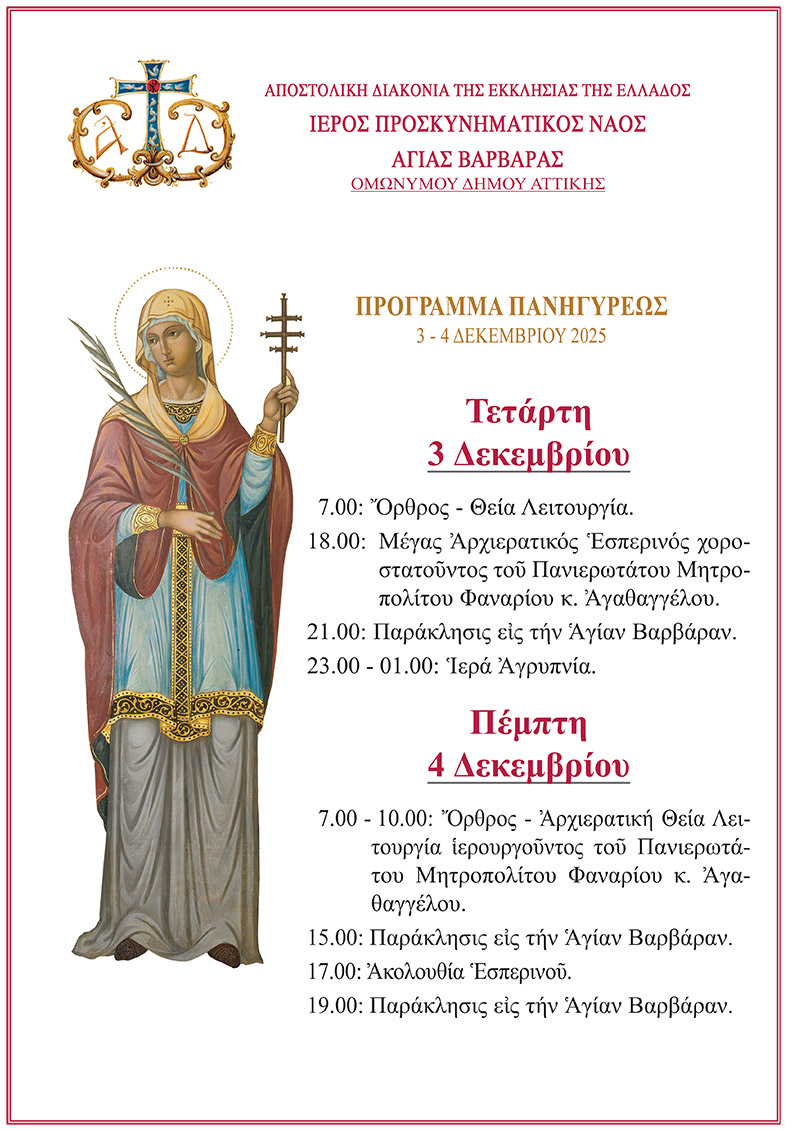 Ο βίος και το μαρτύριο της Αγίας Μεγαλομάρτυρος Βαρβάρας όπως τον συνέγραψε ο Πανιερώτατος Μητροπολίτης Φαναρίου κ. Αγαθάγγελος, Γεν. Διευθυντής της Αποστολικής Διακονίας, με πληροφορίες για το ναό της Αγ. Βαρβάρας στον ομώνυμο δήμο Αττικής και παράρτημα ιερών κειμηλίων του ναού.